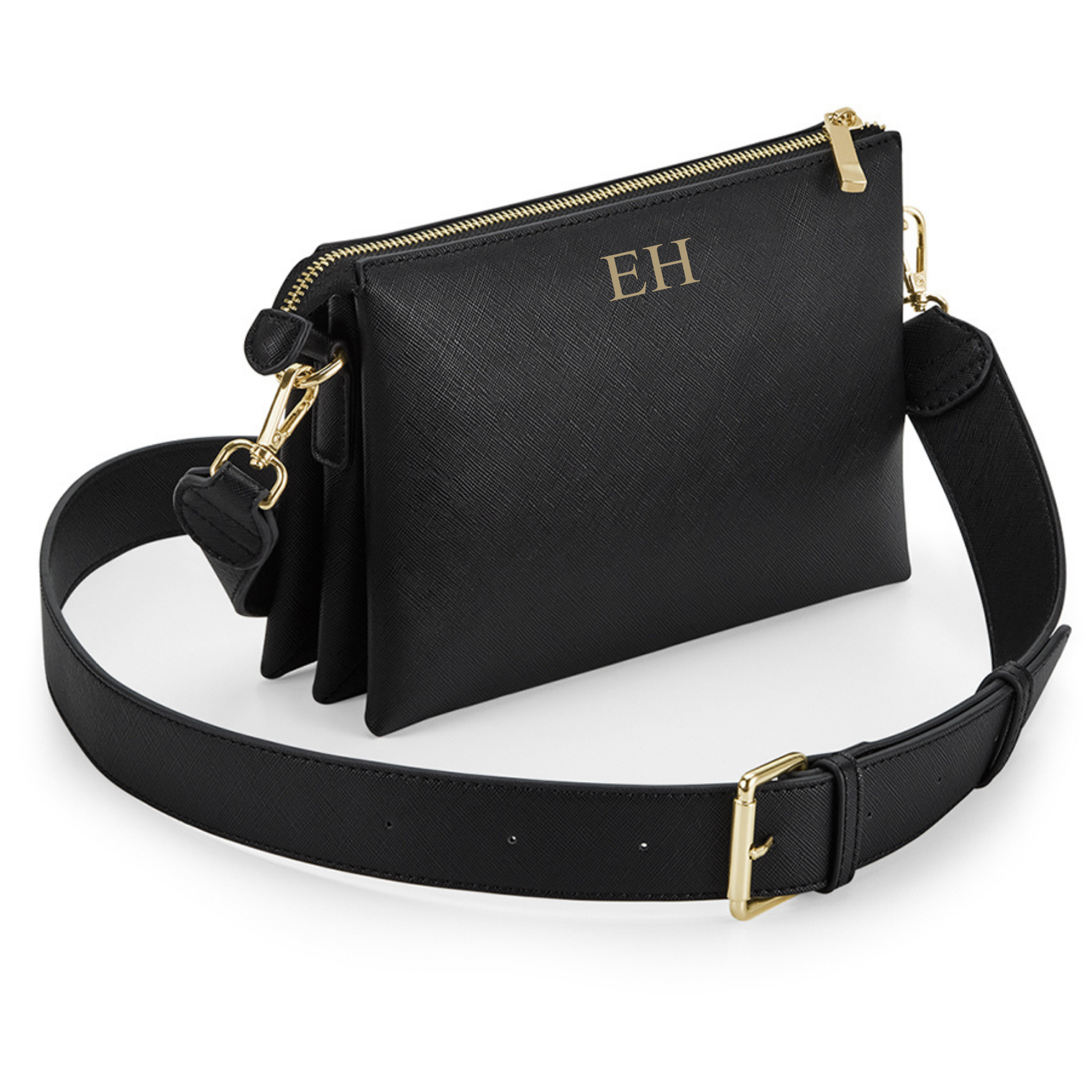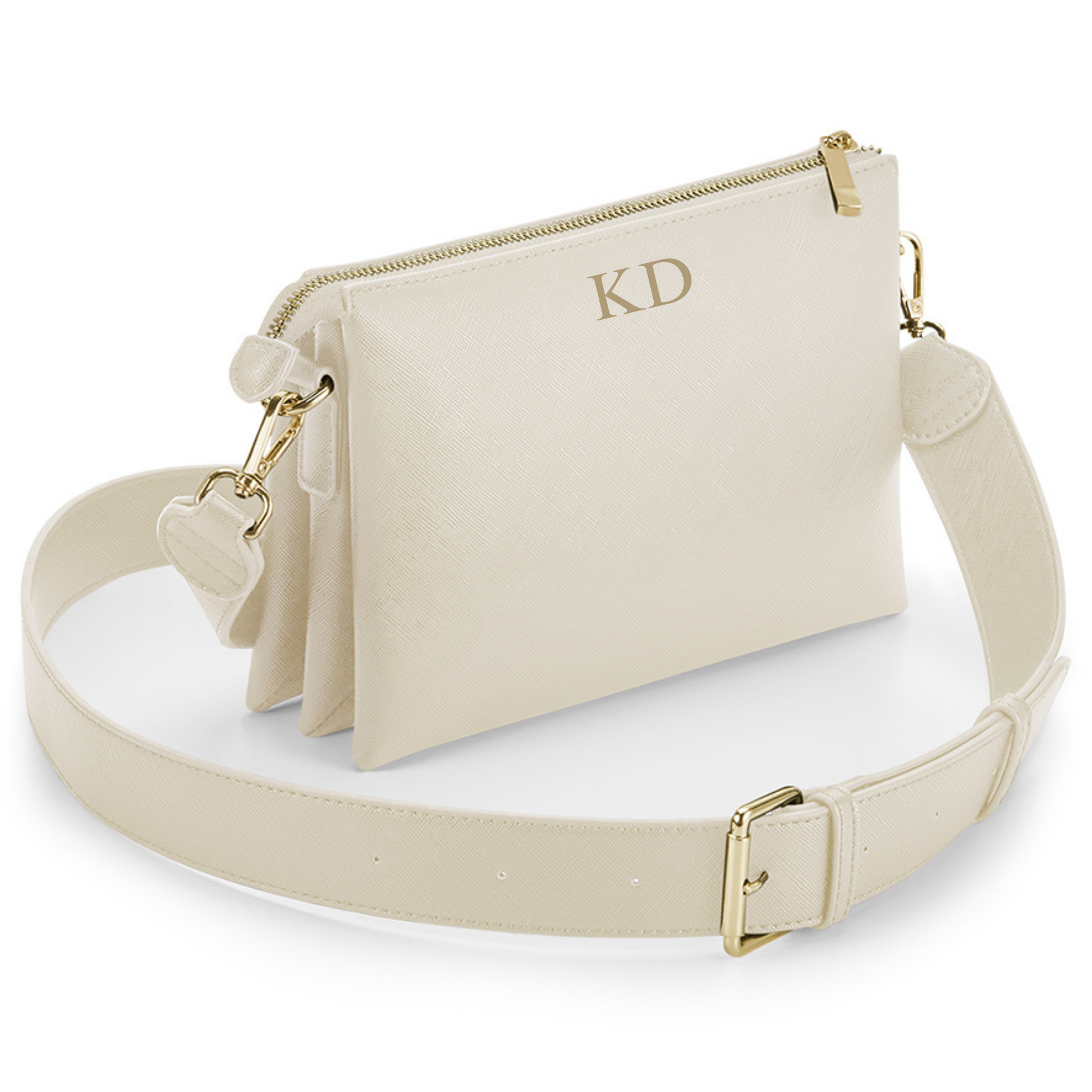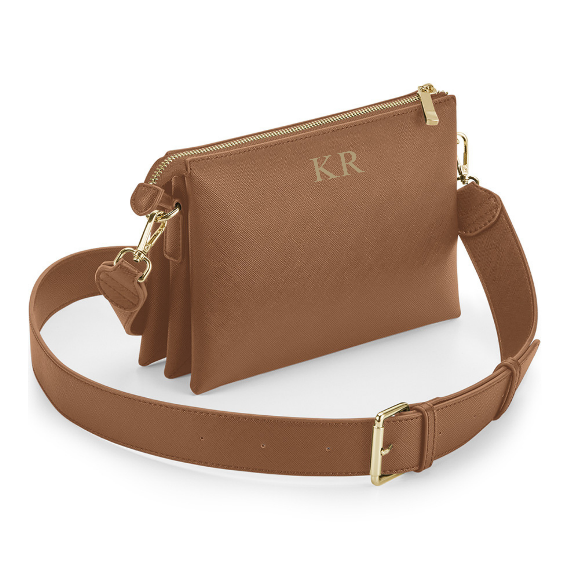 The Boutique Cross Body Bag features a Saffiano fine grain exterior and a soft touch lining, providing both durability and comfort. Its detachable and adjustable shoulder strap allows for versatile styling options. The high shine gold metal zip adds a touch of elegance to this personalized bag. Elevate your style with this fashionable accessory.