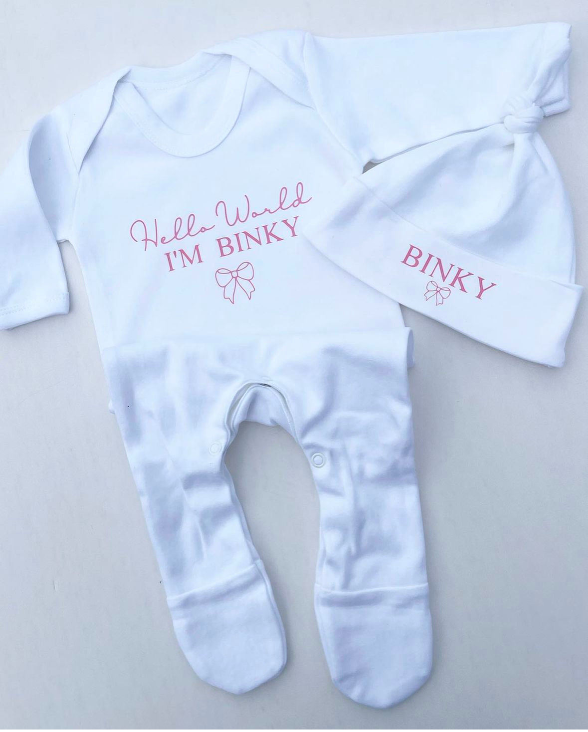 Introducing the Hello World Babygrow and Hat - a perfect way to welcome your precious newborn into the world. This personalized set features a white babygrow and hat with a unique print, making it a thoughtful and special gift for any new parent. Start creating memories with your little one in style.