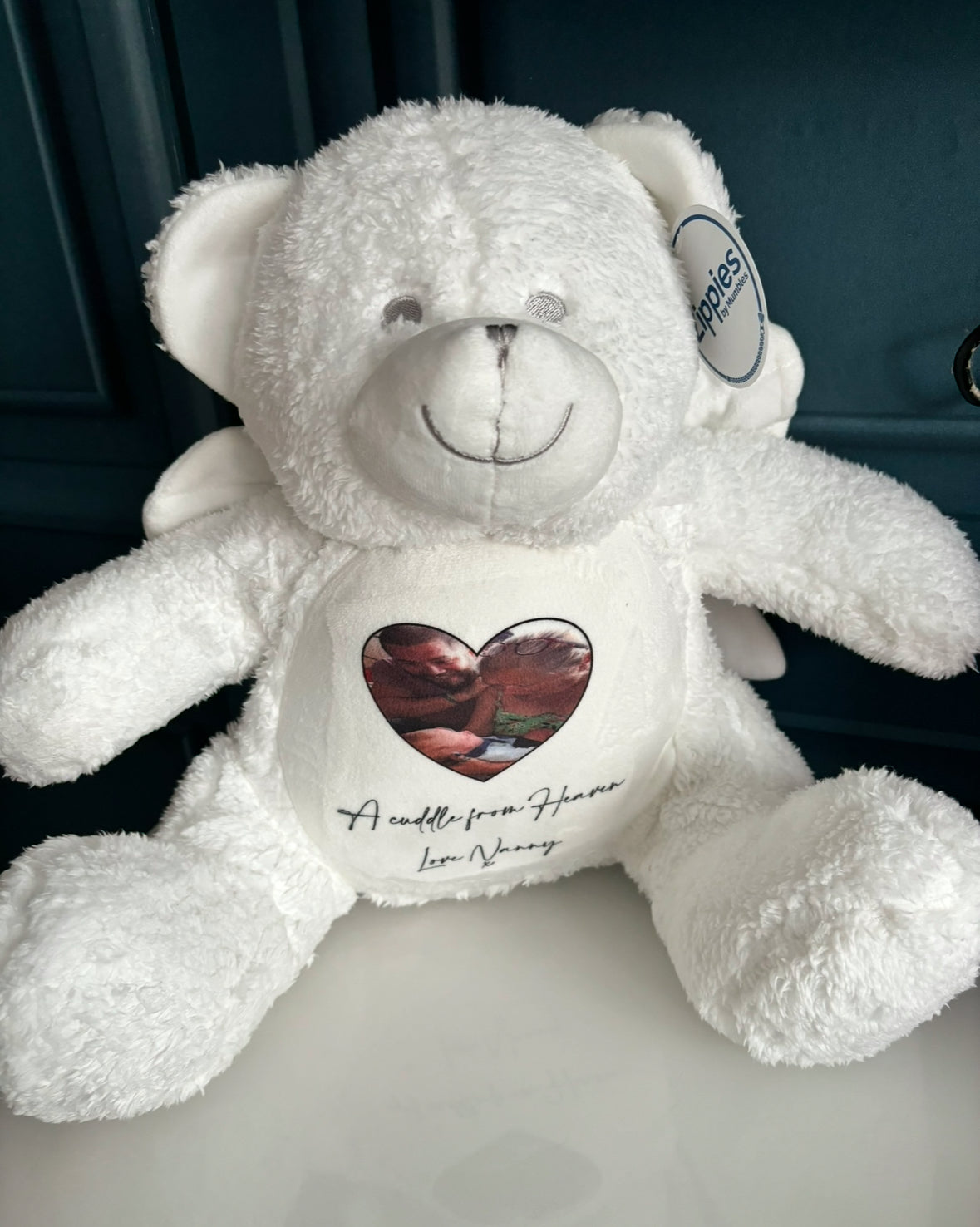 Memory angel bear with personalized photo and text. A heartfelt and unique way to honor the memory of a loved one. Angel wings add a touch of love and comfort to this plush teddy bear. Preserve cherished memories forever with this special gift.
