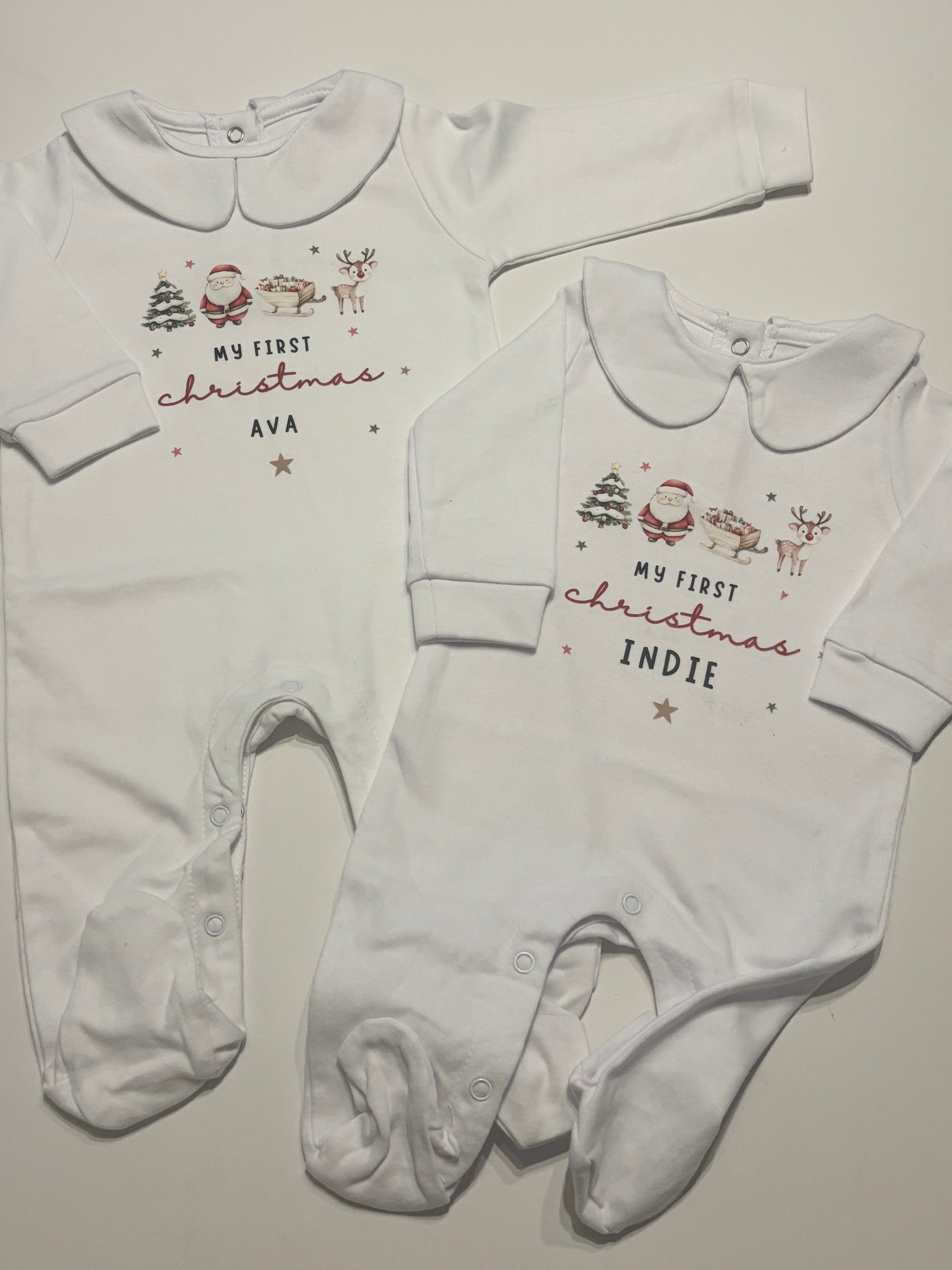 Celebrate your baby's first Christmas in style with our Personalised 1st Christmas babygrow. With a charming Peter Pan collar and a customisable print, this babygrow will be a cherished keepsake for years to come. Made with love and care for your little one's special holiday.