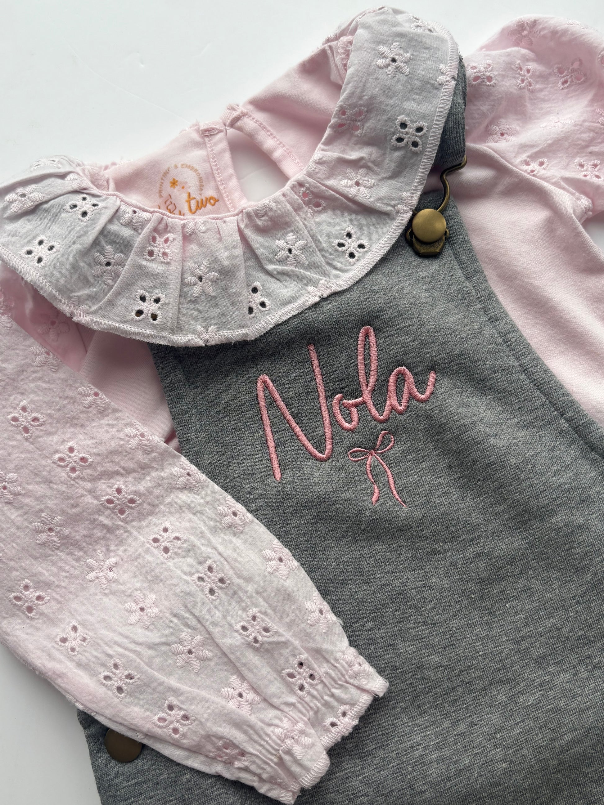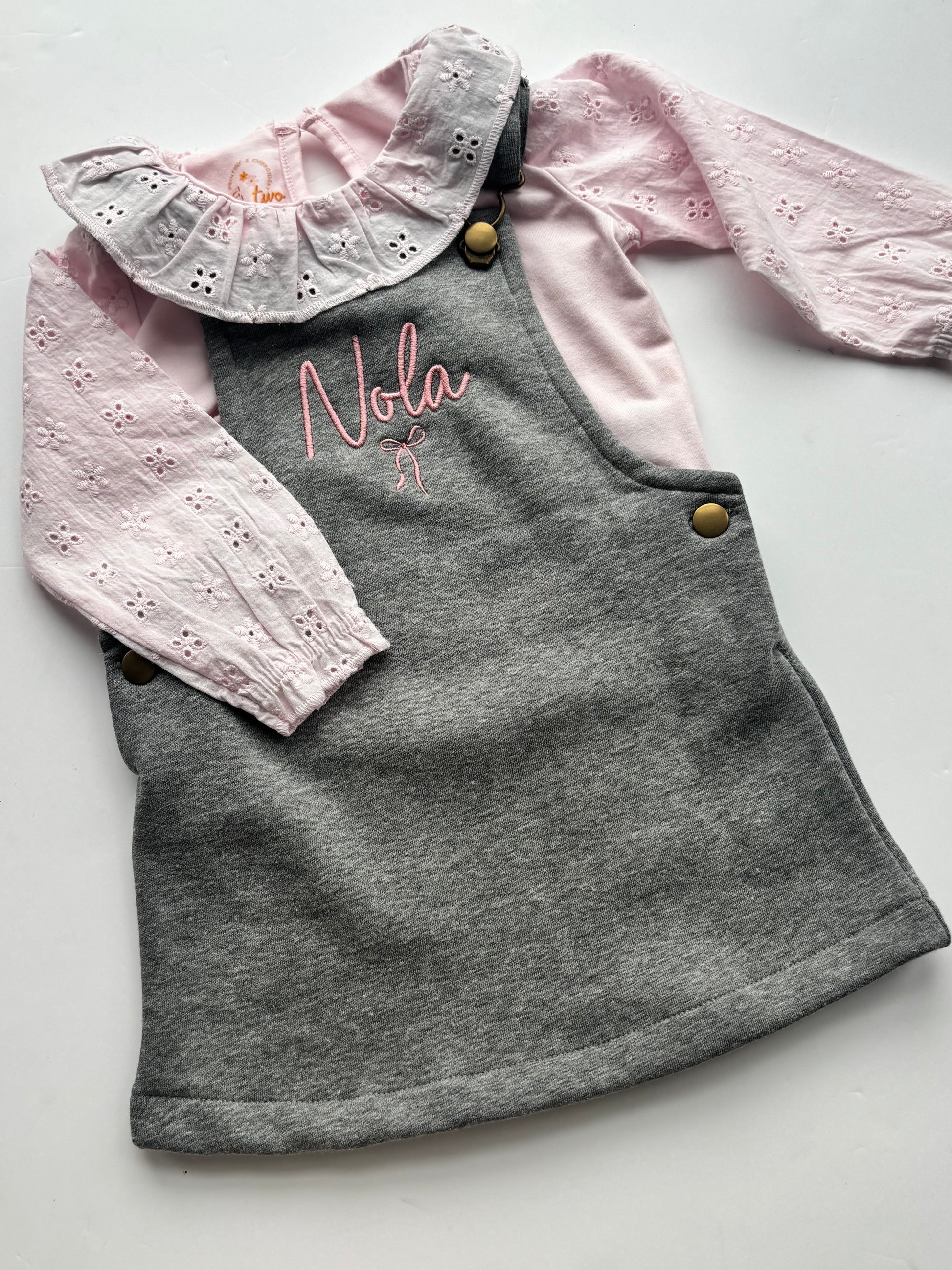This 2-piece dress set includes a pinafore-style dress made of 60% cotton and 40% polyester. Its adjustable buckle, brass buckle and buttons give it a secure yet versatile fit. The dress also features matching top embroidery anglaise sleeves with a frill collar, creating a complete outfit. Personalised embroidery adds a special touch to this charming and practical dress set.