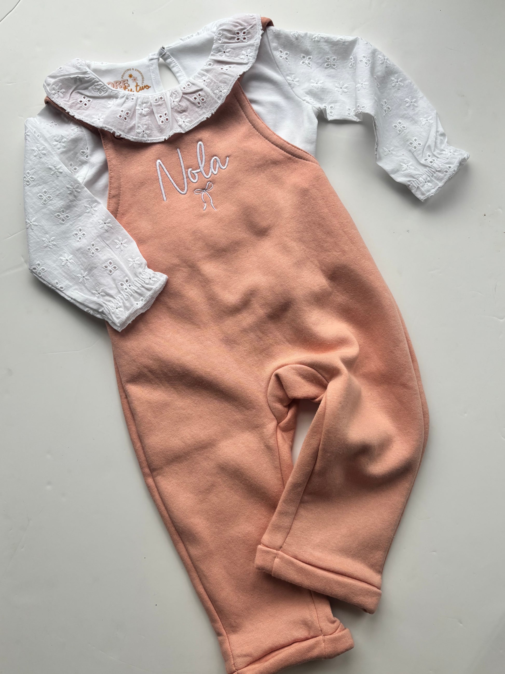 Crafted from soft fleece, this 2 piece dungaree set combines comfort and style. The elasticated back and pocket detail provide a secure yet practical fit. Personalized embroidery and delicate frill collar make it a perfect outfit for any occasion. Includes a cotton and anglaise sleeve top for added elegance.