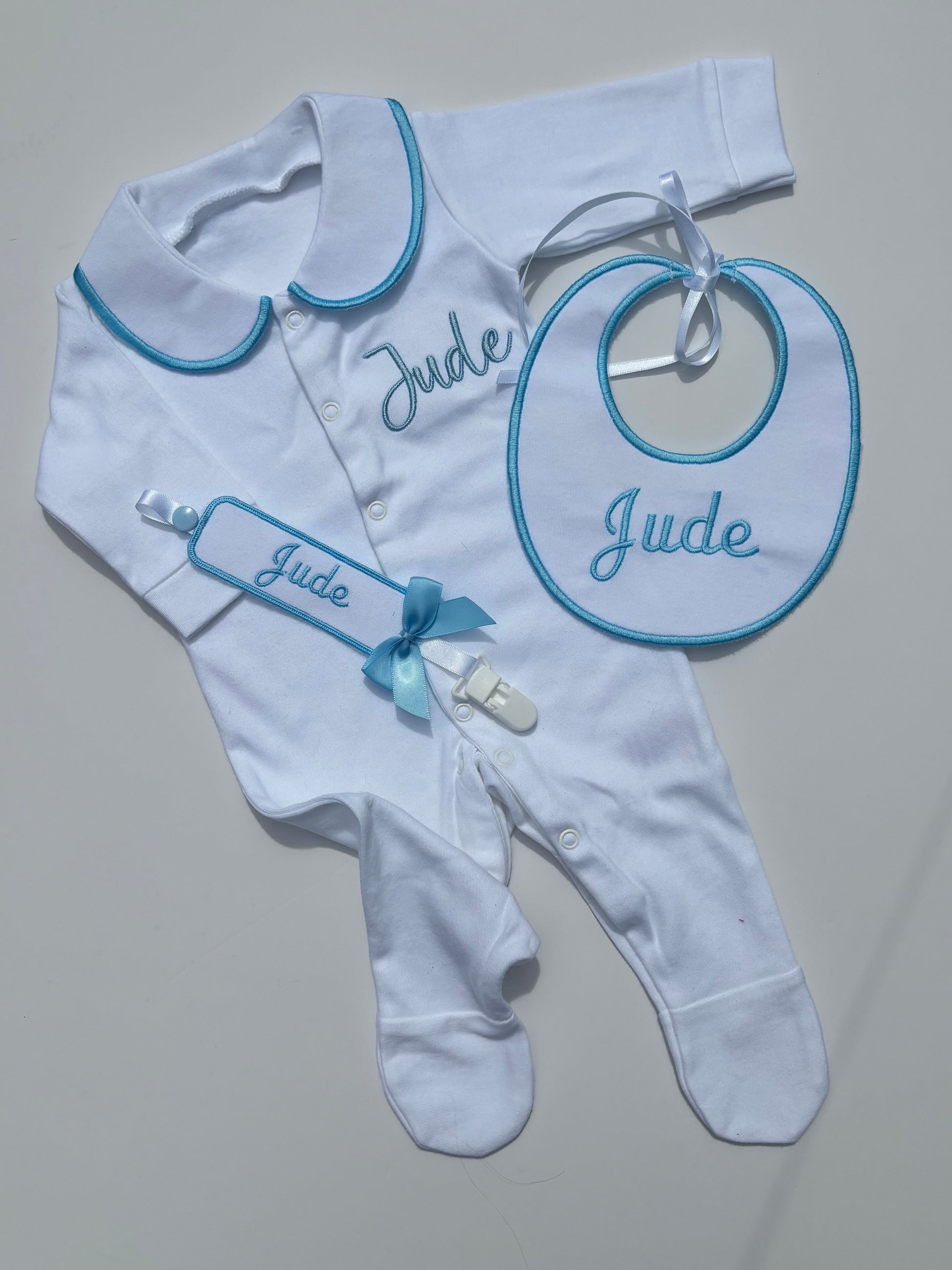 This personalised 3 piece set is perfect for newborns. The set includes a baby grow, bib, and dummy clip, all with beautiful embroidery. The perfect gift for any new parent, this set combines style and functionality. Keep your baby looking cute and comfortable with this must-have set.